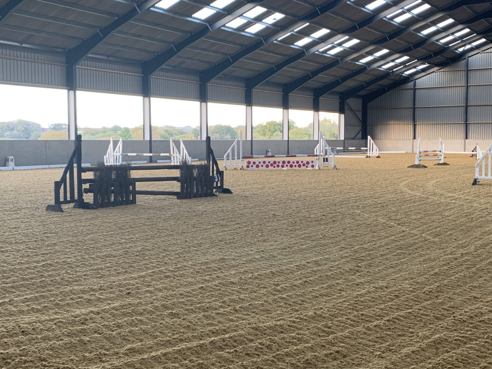 A spacious, all-weather indoor school with a well-maintained surface, perfect for flatwork, jumping, or lessons — ride whatever the weather.